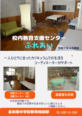 金田南中学校では、令和7年4月に校内支援センター〝ふれあい〟を開設します。