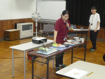 次に、「健康づくりのための食事について」市健康政策課の保健師と管理栄養士の方を講師に講話とワークをしていただきました。