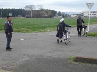 奥沢小方面と金丸小方面の交差点で、保護者ボランティアが生徒の横断を見守ってくださいました。