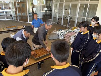 金丸菊の会の皆さんをお迎えし、輪台付けの作業。生徒は質問しながら真剣に取り組み、計画より早く作業を終えることができました。来週はいよいよ市の菊花展へ出品です。輪台付けの作業手順を教えてもらいます