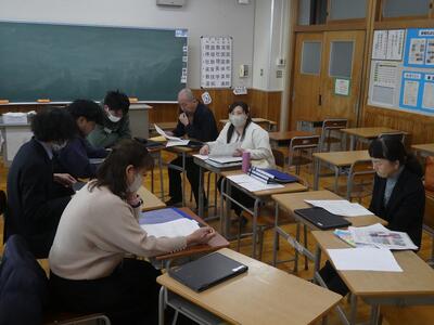 英語部会では、研究授業に向けた指導案について熱心に議論していました。