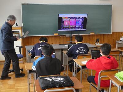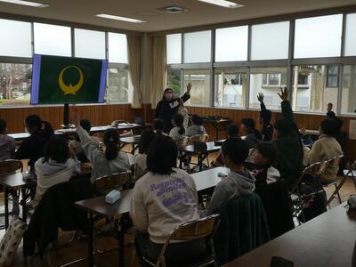 5時間目は、小小合同英語授業。中学校英語教員がクイズも交えて、楽しくまなんでいました。