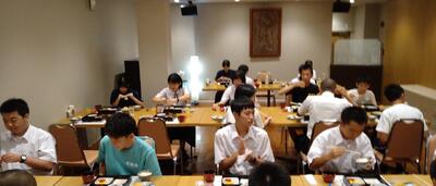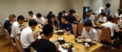 【京都から公共交通機関を使って各班ごとに奈良のホテルに集合でした。全員無事に到着し、揃っておいしい夕食です。2日目も無事終了しました】
