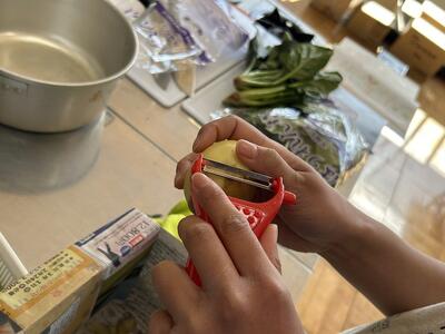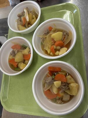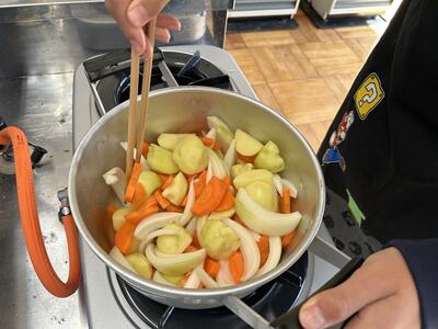 ジャガイモの皮むきやタマネギのくし切りに少し苦戦しながらも、班で協力してどの班もおいしく仕上げることができました。