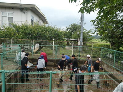 今年度も調整池の泥上げと植木の剪定に分かれて作業を行いました。