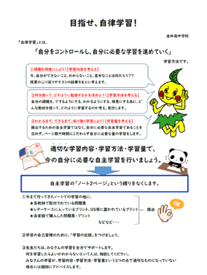 つまり、適切な学習内容・学習方法・学習量で、今の自分に必要な自主学習を行うことが自律学習であり、この学習を南中生全員ができるようになってほしいと思います。