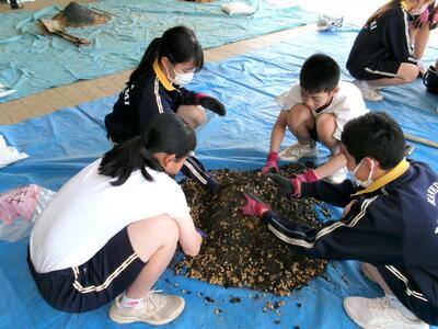 今年度の菊栽培は、2年生が担当します。技術の時間を使って一人一鉢栽培する予定です。今日は、土作りを行いました。腐葉土、赤玉などを丁寧に混ぜ合わせる作業です。小さい子どもの頃に戻ったような表情で、楽しそうに土を混ぜ合わせていました。