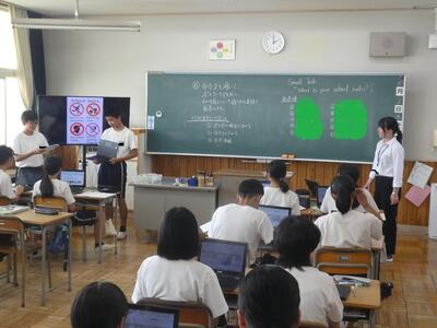教育実習生 研究授業 投稿: 金田南中学校 (14:17) カテゴリー: 教職員 10月2日(木)1年生の英語で教育実習生の研究授業を実施しました。 3週間の教育実習もあと2日。何度も書き直した指導案をもとに一生懸命授業。 生徒もがんばっていました。 モニターを使って学習内容を説明生徒の活動を支援発表は少し離れたところで見守って Tweet -
