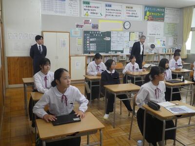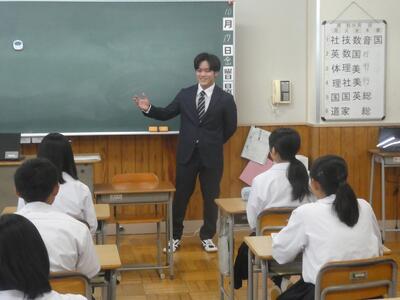 1年生に教育実習生 投稿: 金田南中学校 (15:35) カテゴリー: 1年生 10月20日(月)より2週間、教育実習生が来ています。 今回は1年生に理科の教育実習生。初日は自己紹介と授業参観。少し緊張気味でした。 校長室からオンラインで全学年に自己紹介1年生の教室では前に立って自己紹介 Tweet -