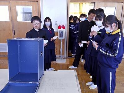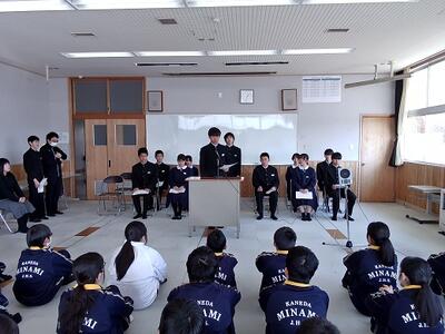 令和8年度生徒会役員選挙 投稿: 金田南中学校 (02/19) カテゴリー: 生徒会 2月18日(水)令和8年度生徒会役員選挙の立会演説と投票が行われました。 会長候補、副会長候補から公約が示され、それをもとに投票。 来年度の生徒会役員が決定します。 立候補者と応援演説者立会演説の様子投票風景 Tweet -