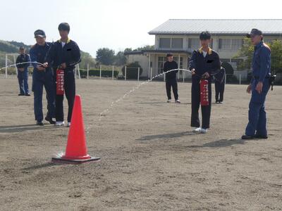 各学年代表2名が水消火器で消火体験
